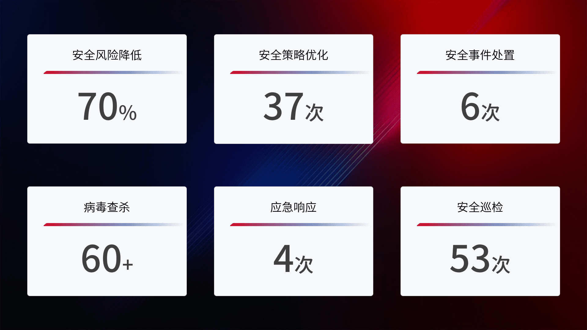 提供全面的安全事件报告体系,,,,包括处置报告、、、、周报、、季度和年度总结,,,结合持续监控,,,帮助客户深入了解网络安全状况。。
