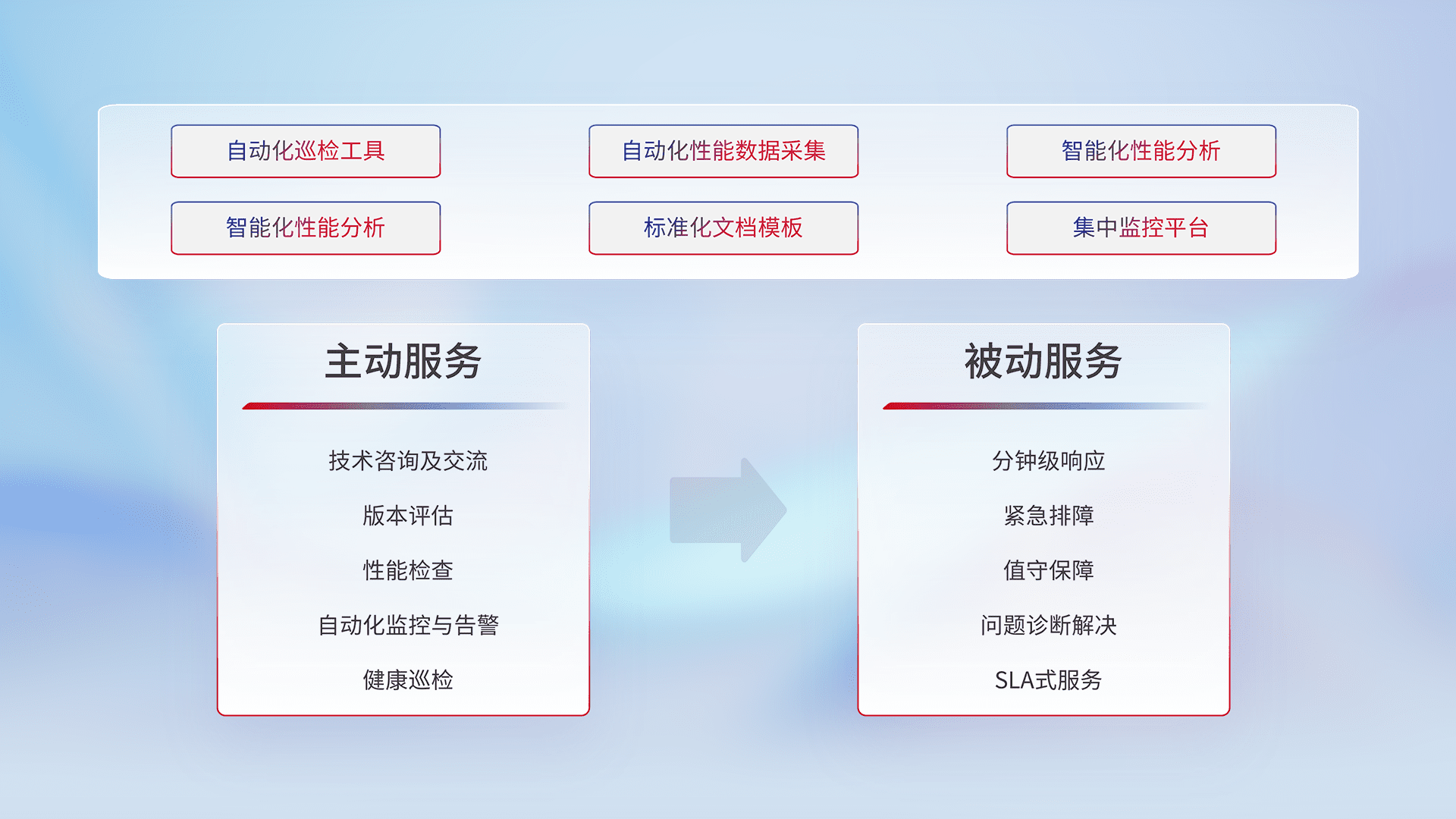 智能化工具和标准化文档,,保障服务质量,,,提供主动服务(包含技术咨询、、、、版本评估、、、、性能检查、、、自动化监控与告警、、、健康巡检)和被动服务包含(分钟级响应、、、紧急排障、、、值守保障、、、、问题诊断解决、、SLA服务)。。。。