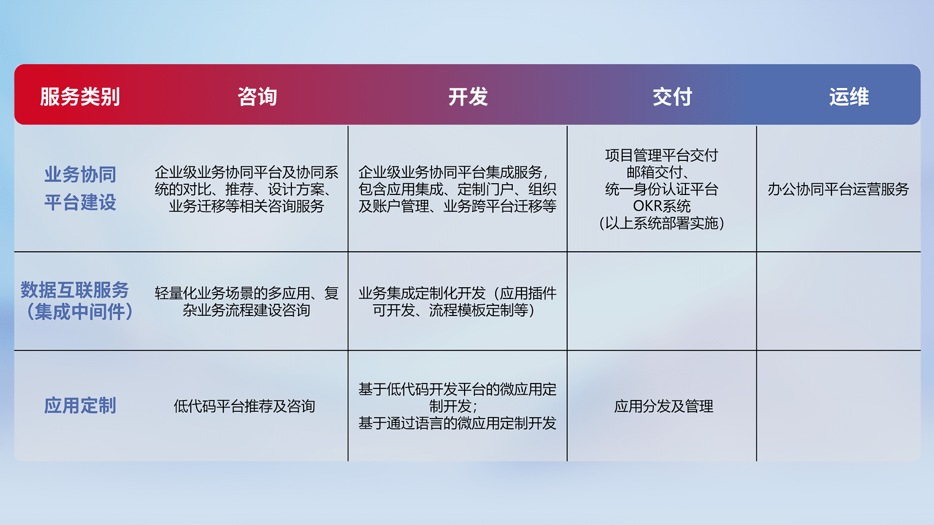 针对钉钉、、、企微、、IDaas等平台级产品提供产品的规划、、、、方案、、、交付、、、定制化开发等服务,,实现如统一协同办公、、智能客户服务、、、混合会议管理、、、、智能数据查询、、、等业务场景,,实现数字化转型。。。。